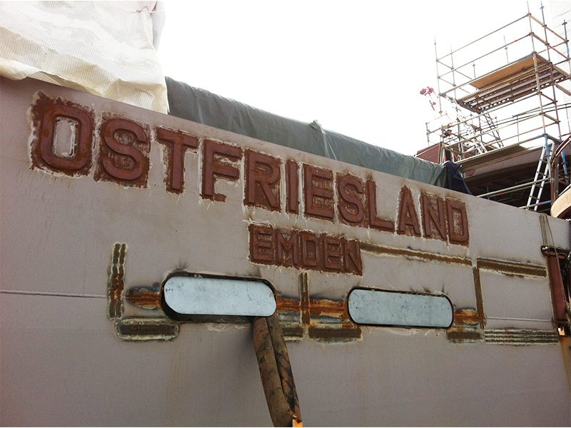 Damit an Bord von MS „Ostfriesland“ geschützt vor Wind und Wetter Anstrich-Arbeiten vorgenommen werden konnten, wurde die Fähre vom 29.01.2015 bis Anfang März 2015 „eingehaust“. Unter dem beeindruckenden Zeltdach wurde so ungestört Farbe aufgetragen und weitere Arbeiten ausgeführt werden.