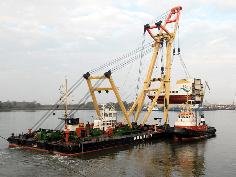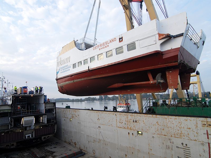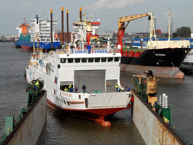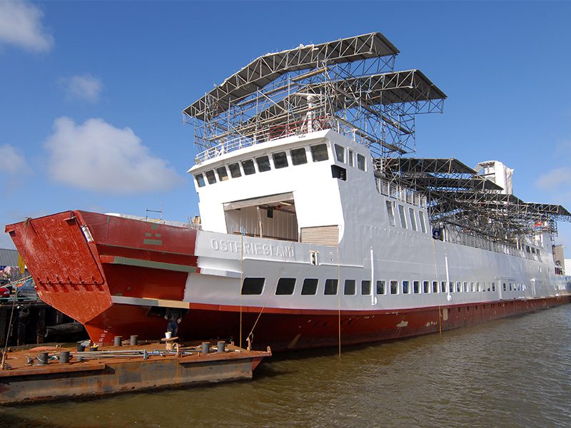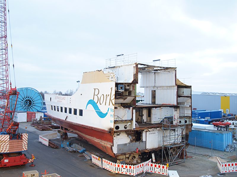 Am Sonntag, den 20. Juli 2014 hat das neue Achterschiff für die Borkumfähre MS „Ostfriesland“ die Bauhalle verlassen und wurde per Kran an Bord eines Condock-Schiffes verladen, um so zur Außenstelle der Brenn- und Verformtechnik (BVT) nach Bremerhaven verschifft zu werden.